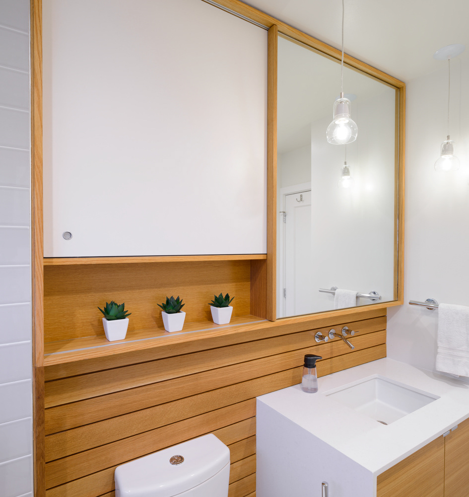 Details play a crucial role in creating a seamless and polished look. Ensuring that the tile alignment with both the window and shower niche was precise contributed to a clean, cohesive aesthetic. Similarly, the design of the mirror and medicine cabinet was meticulously planned to maximize the available space, integrating functionality with style. Notice how the joints in the wood wall align perfectly with the vanity countertop and top of toilet.